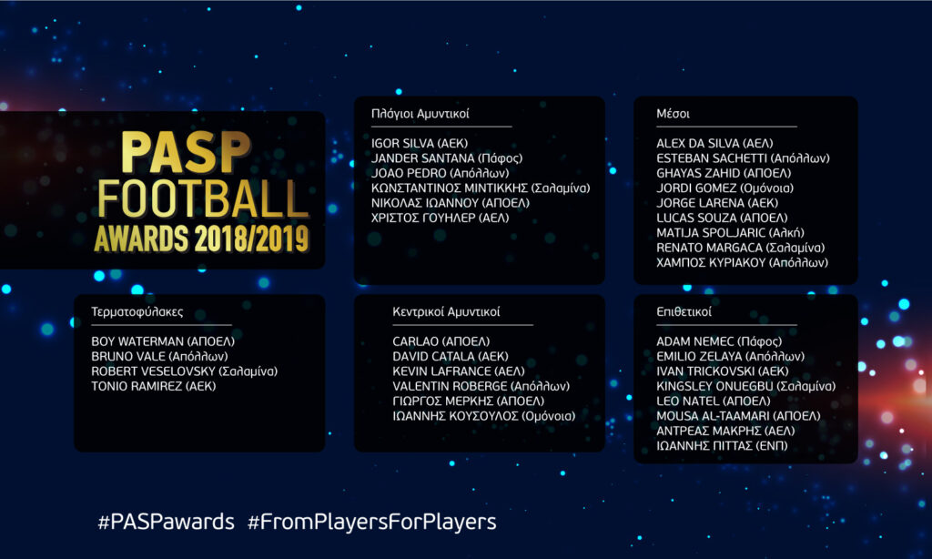 Τα «PASP Football Awards 2018-19» βρίσκονται υπό την αιγίδα της Κυπριακής Ομοσπονδίας Ποδοσφαίρου. Οι φετινοί χορηγοί της εκδήλωσης είναι οι UNICARS, STOIXIMAN, Πανεπιστήμιο Λευκωσίας, Lander Polar Ice Gel, Buffalo Wings & Rings Restaurant και τα Υγιεινά Έτοιμα Γεύματα YUMMO.