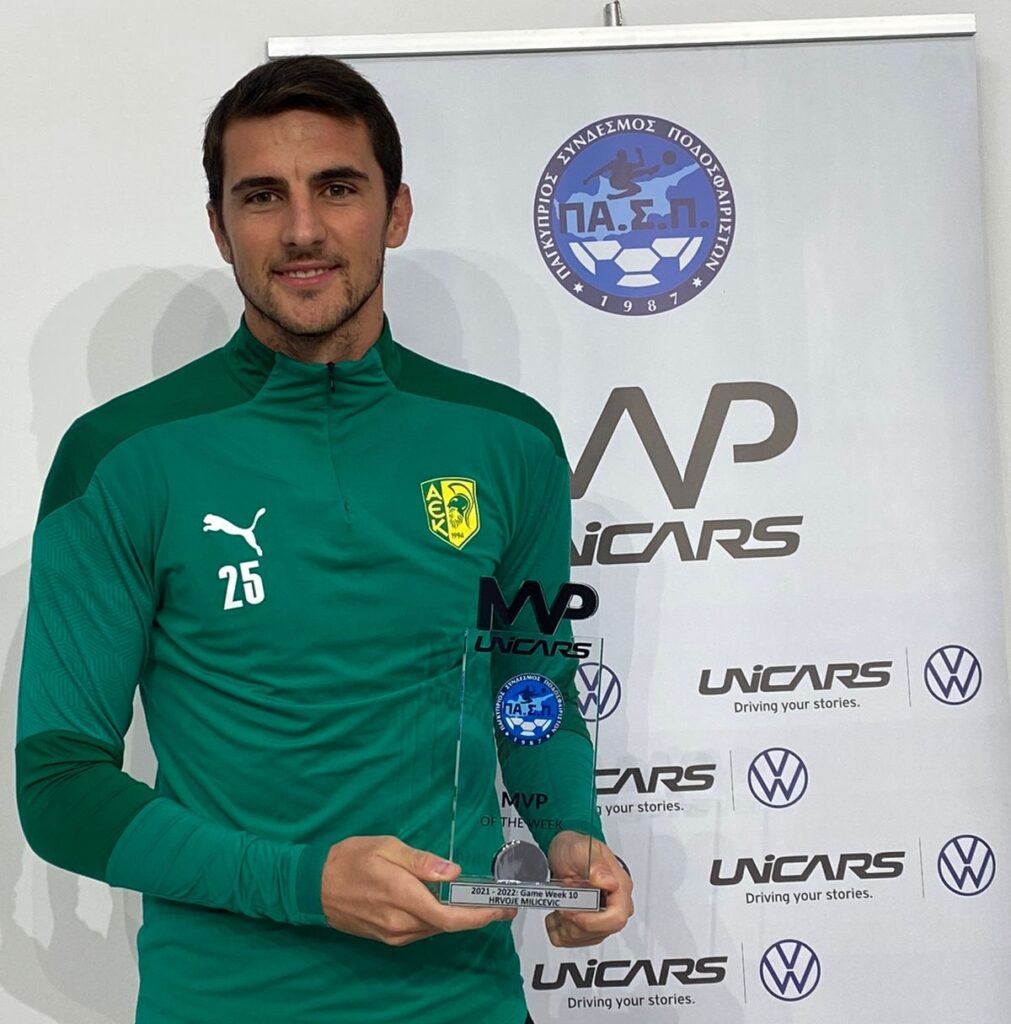 Ο ποδοσφαιριστής της ΑΕΚ, Hrvoje Milicevic, παρέλαβε από τον ΠΑ.Σ.Π. το βραβείο Unicars MVP by Volkswagen για την 10η Αγωνιστική του Πρωταθλήματος. Ο Κροάτης αμυντικός ήταν ο πολυτιμότερος παίκτης της 10ης Αγωνιστικής του Πρωταθλήματος λαμβάνοντας τη βαθμολογία 282 στο InStat index.